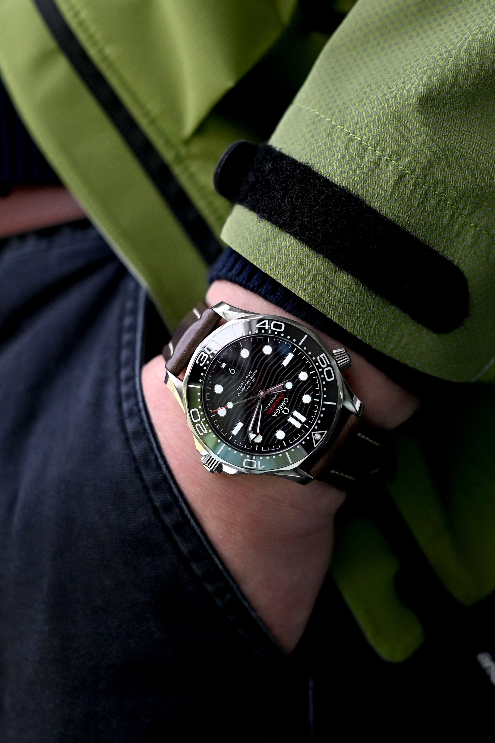 エメラルドの優雅さが海の精密さと出会う - オメガ シーマスター ダイバー 300Mが、その豊かな質感の緑色のジャケットに対して注目を集め、柔らかなホーウィン クロムエクセル レザーウォッチストラップが、真のスタイル愛好者だけが理解する、アウターウェアとクラシックな時計を組み合わせる際の土のような洗練を加えます。