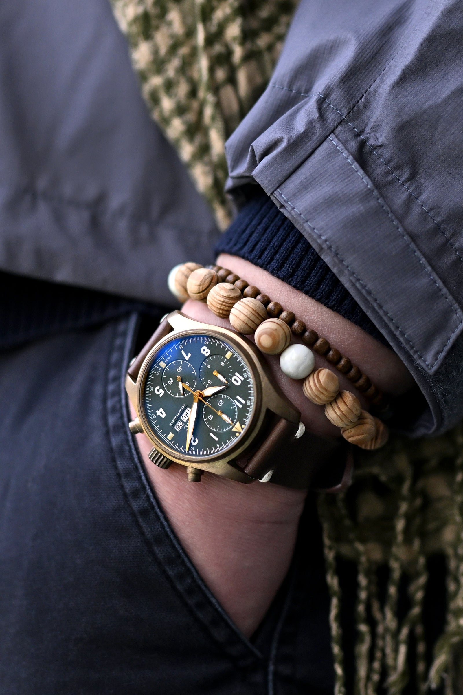 自信から生まれる非chalantなスタイル - IWCパイロットスピットファイアクロノグラフブロンズが、そのダークグレーのジャケットのクリーンなラインに対して独特のパティナを形成し、パターンのあるコットンスカーフが視覚的な興味を加え、ホーウィンレザーの時計バンドと自然な木のアクセサリーとのバランスを取ることで、言葉を使わずに多くを語る effortlessなスタイルを生み出します。