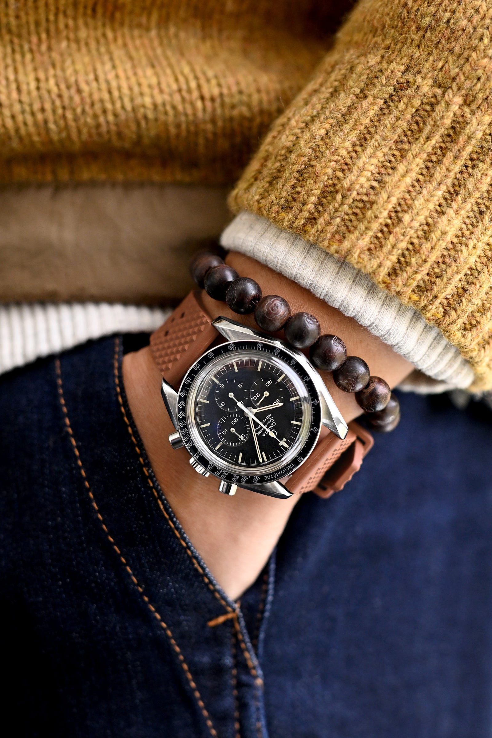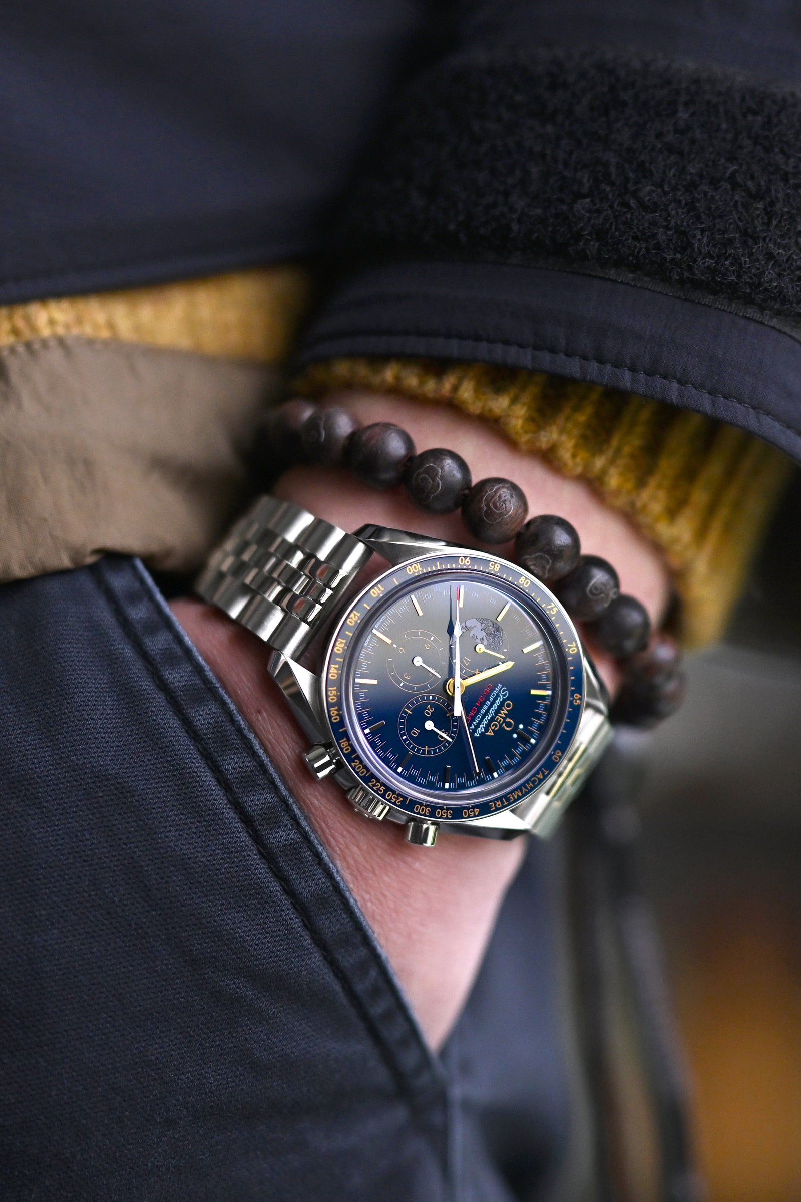技術的なレイヤリングが意図的にマスターされた - OMEGA スピードマスター ムーンウォッチ アポロ XVII の チタン製の時計バンドは、防水ジャケットと快適なセーターの組み合わせに対して印象的な工業的調和を生み出し、仏教のビーズがこの落ち着いたスタイルのアレンジに内省的な要素を加え、季節の温度を軽やかにナビゲートするのに最適な洗練されたスタイルを実現します。