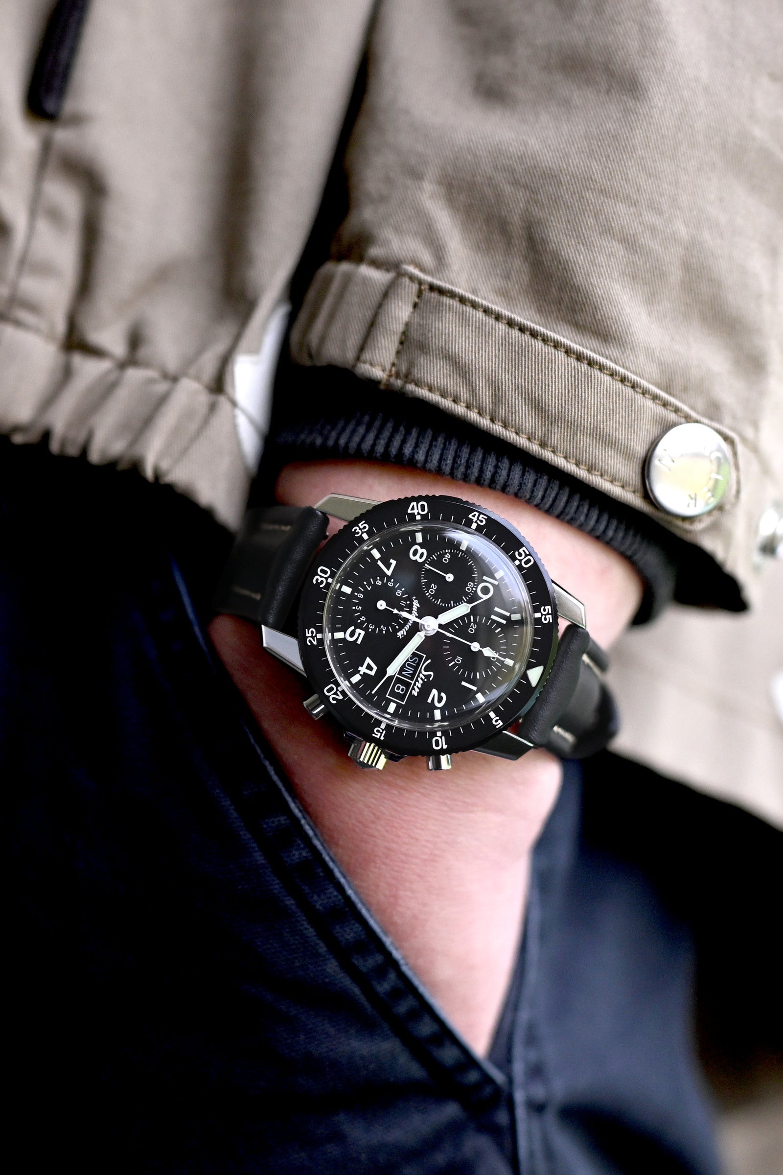 このフレームでは、ヘリテージテクスチャーが完璧に融合しています - 特徴的なダイヤモンドパターンのビンテージオックスフォードキルティングが、目的を持ったSinn 103 STパイロットクロノグラフの理想的なキャンバスを作り出し、手作りの黒いフランス製レザーバンドがジャケットの構造的な肩に対してちょうど良いモノクロームスタイリングのバランスを提供します。