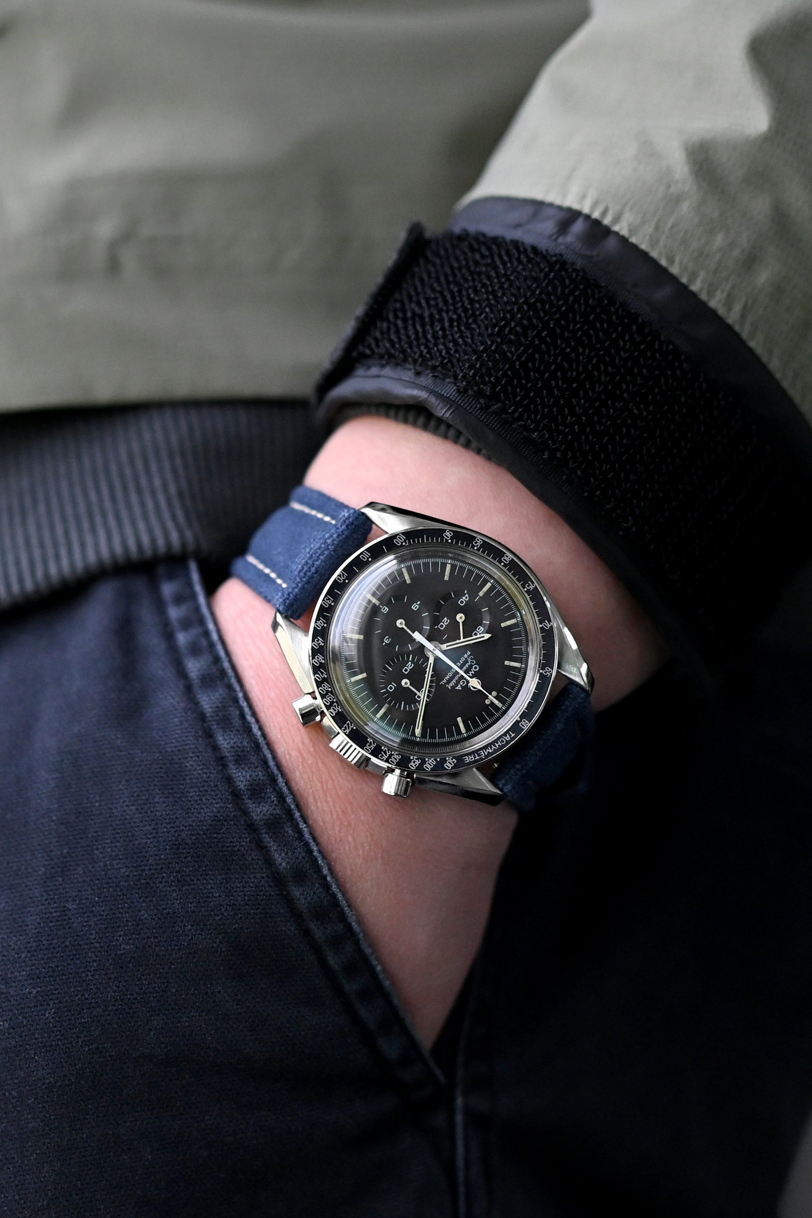 都市の機能性と天体の歴史が融合 - ウインドブレーカーの深いトーンと低プロファイルの技術的な素材が控えめなプロフェッショナルのための微妙な背景を作り出し、伝説のオメガ スピードマスター ムーンウォッチ 1969が派手さを避けながらも注目を集めることを可能にします。一方で、ネイビーキャンバスの時計ストラップは、クライアントとの会議から夜のイベントへとシームレスに移行するための洗練された美学のために必要なテクスチャーのコントラストを提供します。