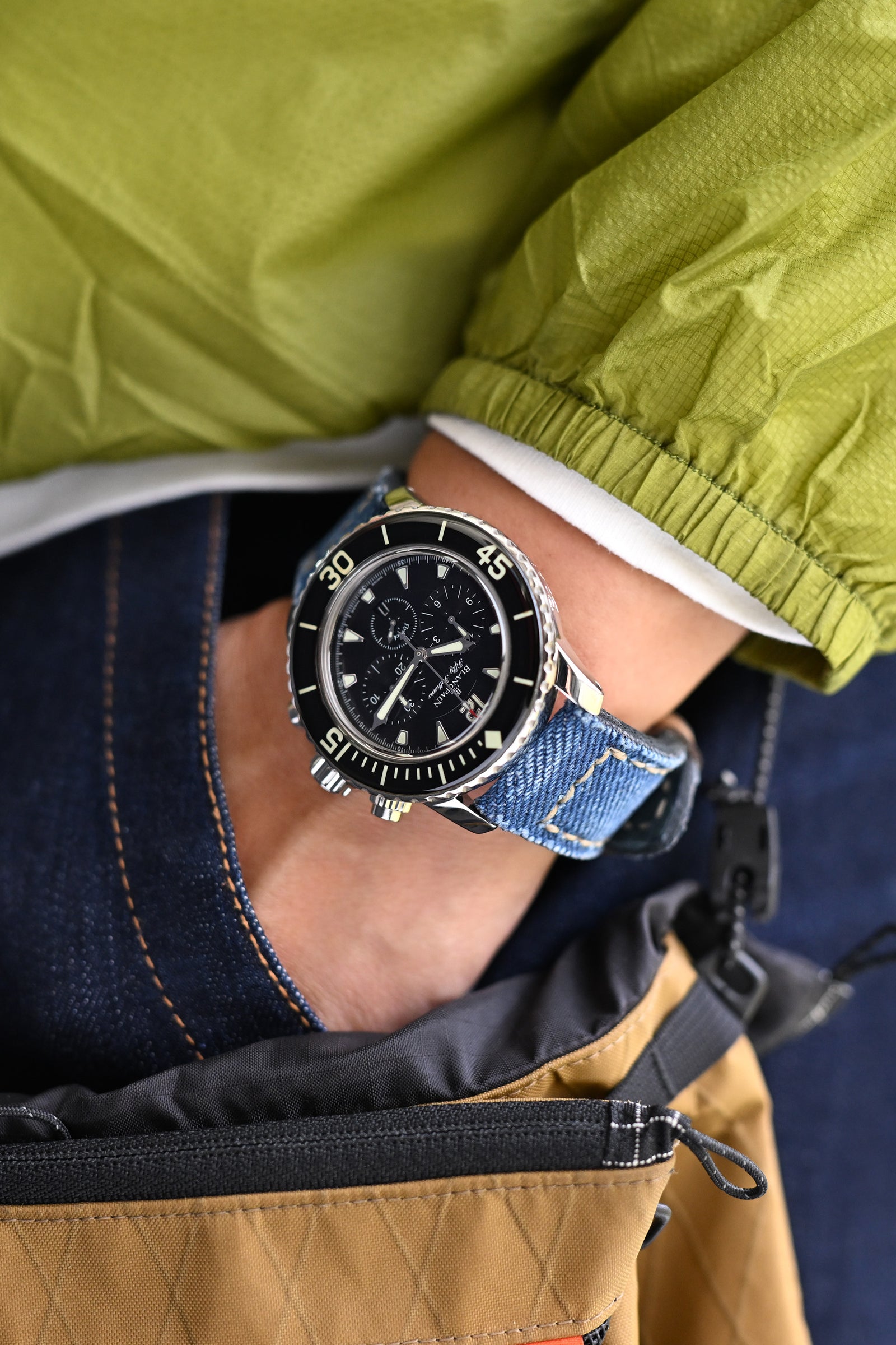 週末の解放を捉えた - 軽量のスカイフロージャケットは、ストリームラインされた肩の補強が、強力なブランパン フィフティ ファゾムズ フライバック クロノグラフのカジュアルな基盤を提供し、その精密なメカニズムは明らかに冒険的な旅を経てきたガニー手作りデニムブルーウォッシュキャンバスウォッチストラップによって完璧に補完されています。