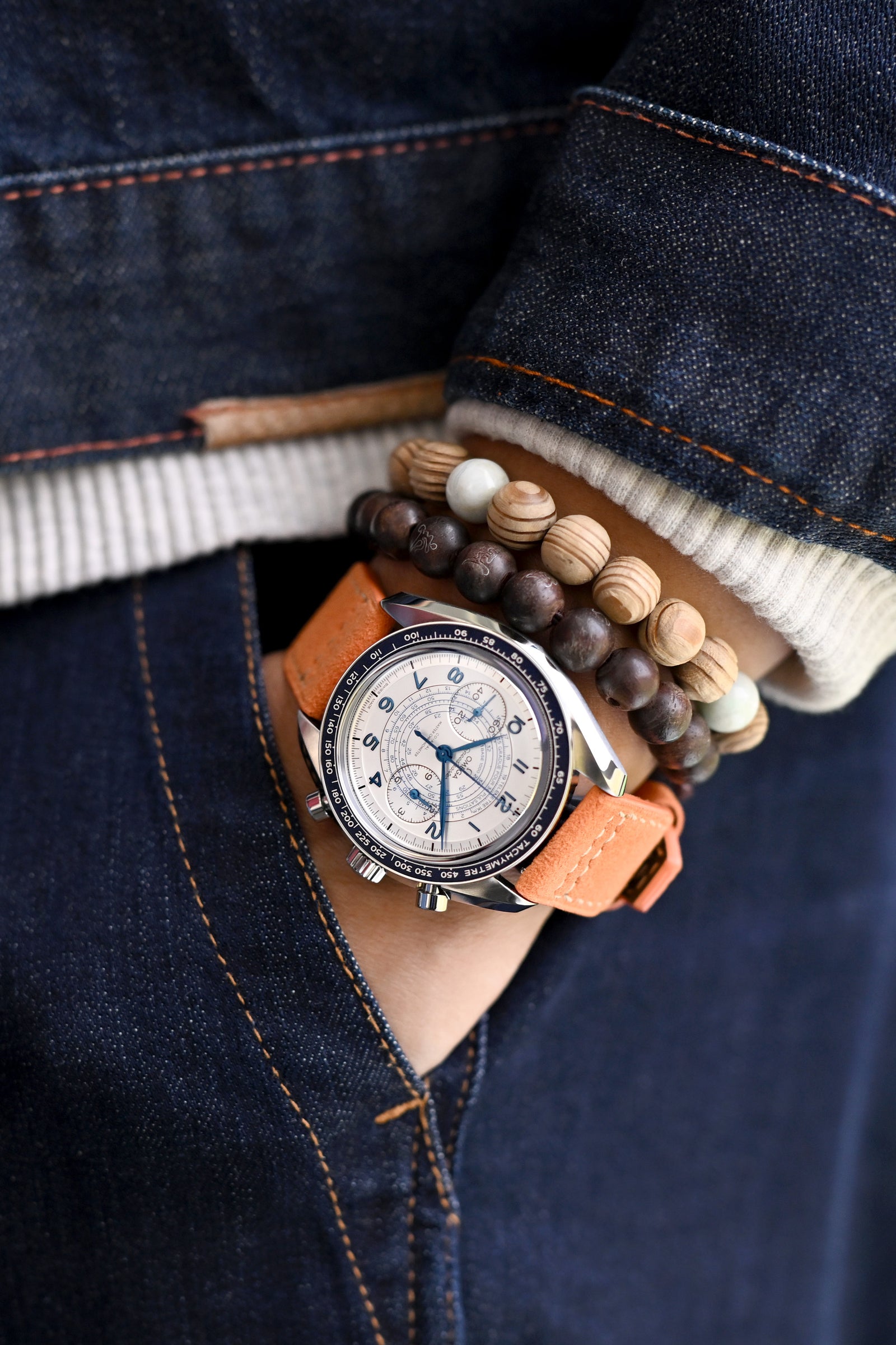 反抗的なテクスチャープレイの極み - 特徴的なコントラストステッチと洗練されたレザーのディテールを持つ頑丈なデニムジャケットは、オメガ スピードマスター クロノスコープ コーアクシャル マスター クロノメーターの技術的な輝きを引き立てる実用的な舞台を設定し、鮮やかなオレンジのアルカンターラ製の時計バンドは、自然なヒノキとスピリチュアルビーズに対して予想外のポップをもたらし、従来のファッションルールに挑戦するアバンギャルドなスタイリングを実現します。