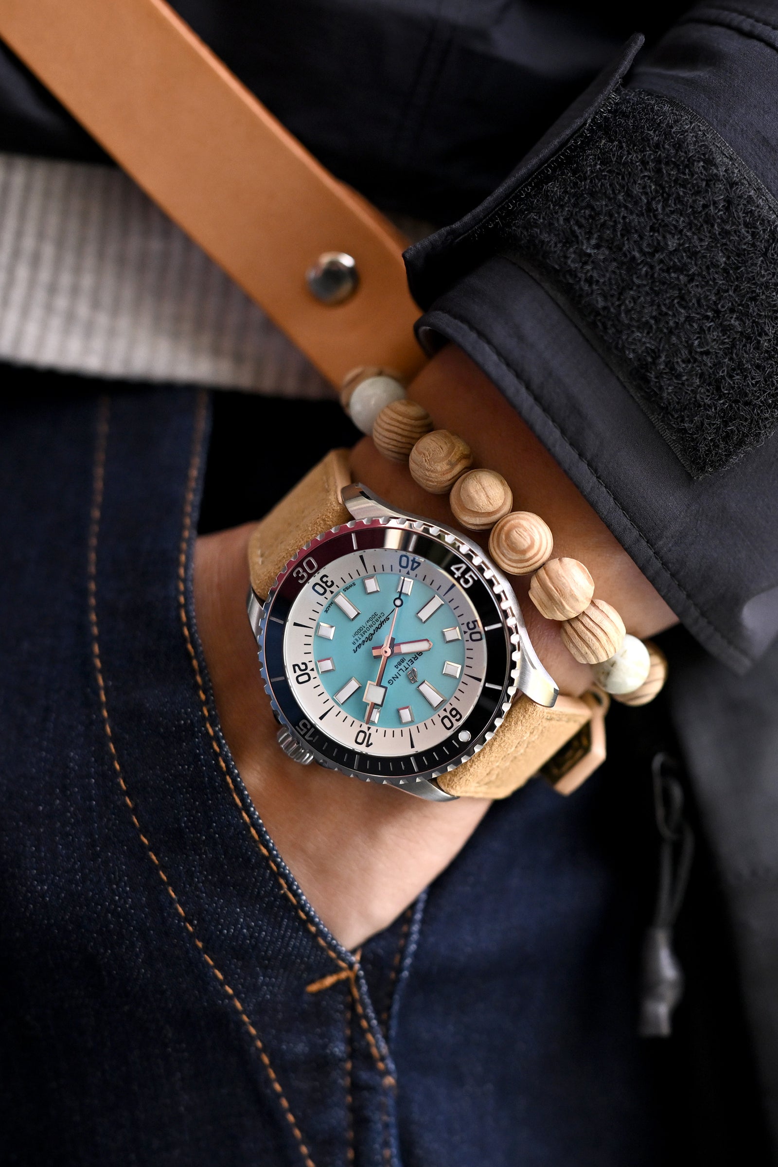 モノクロマティックなマスタリーに青のスプラッシュを加えた - ブライトリング スーパーオーシャン オートマティック 44の明確なターコイズダイヤルは、スリークなブラックジャケットのミニマリストシルエットと隠れたポケットに対して完璧な焦点を作り出し、カーキのアルカンターラ製ウォッチストラップと日本の杉が、この海洋的なタイムピースに日常の都市探検のための地に足のついたファッションバランスを提供します。