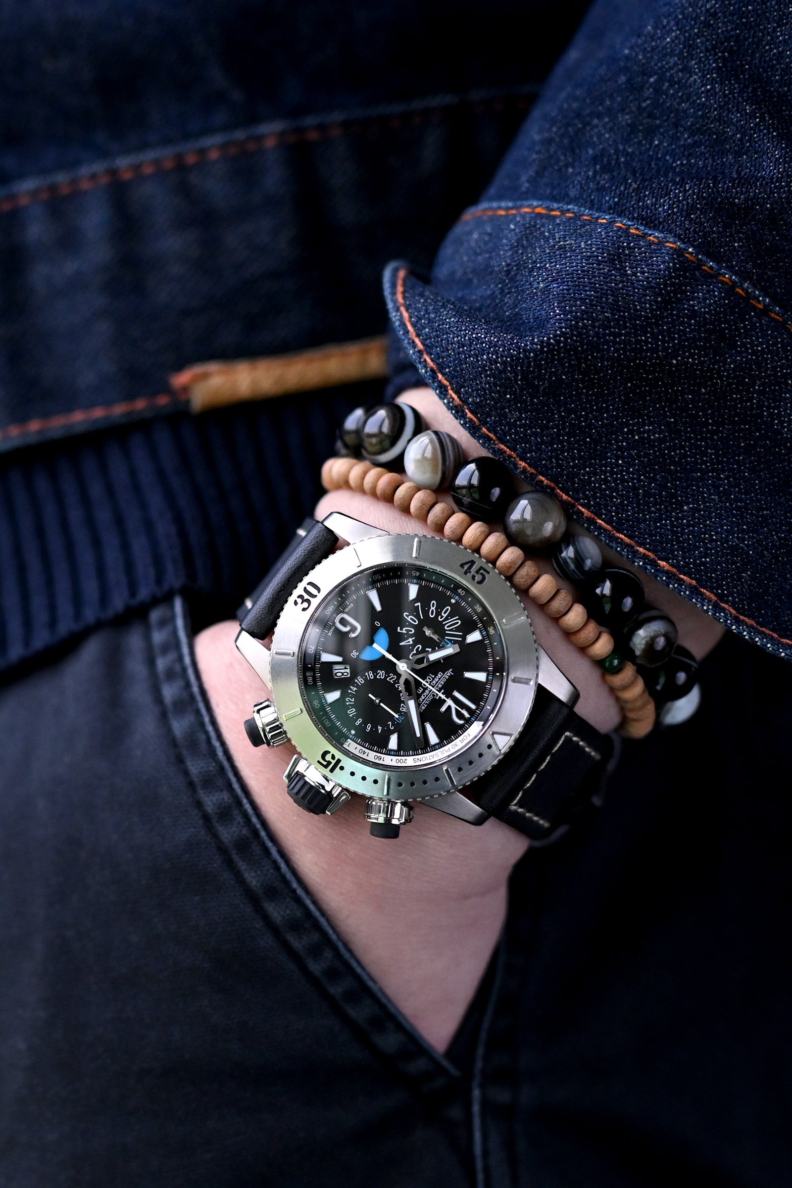 素材の生々しさが視覚的な詩を生み出す - ジャガー・ルクルト マスターコンプレッサー ダイバー クロノグラフ チタンのケースは、アイコニックなエヴィスのデニムジャケットのストリートスタイルの美学と調和し、タイガーアイとアガーウッドのビーズが神秘的な要素を導入し、バレニアレザーの時計バンドの物語あるパティーナを引き立て、個人的な物語を語る洗練されたスタイルを実現します。