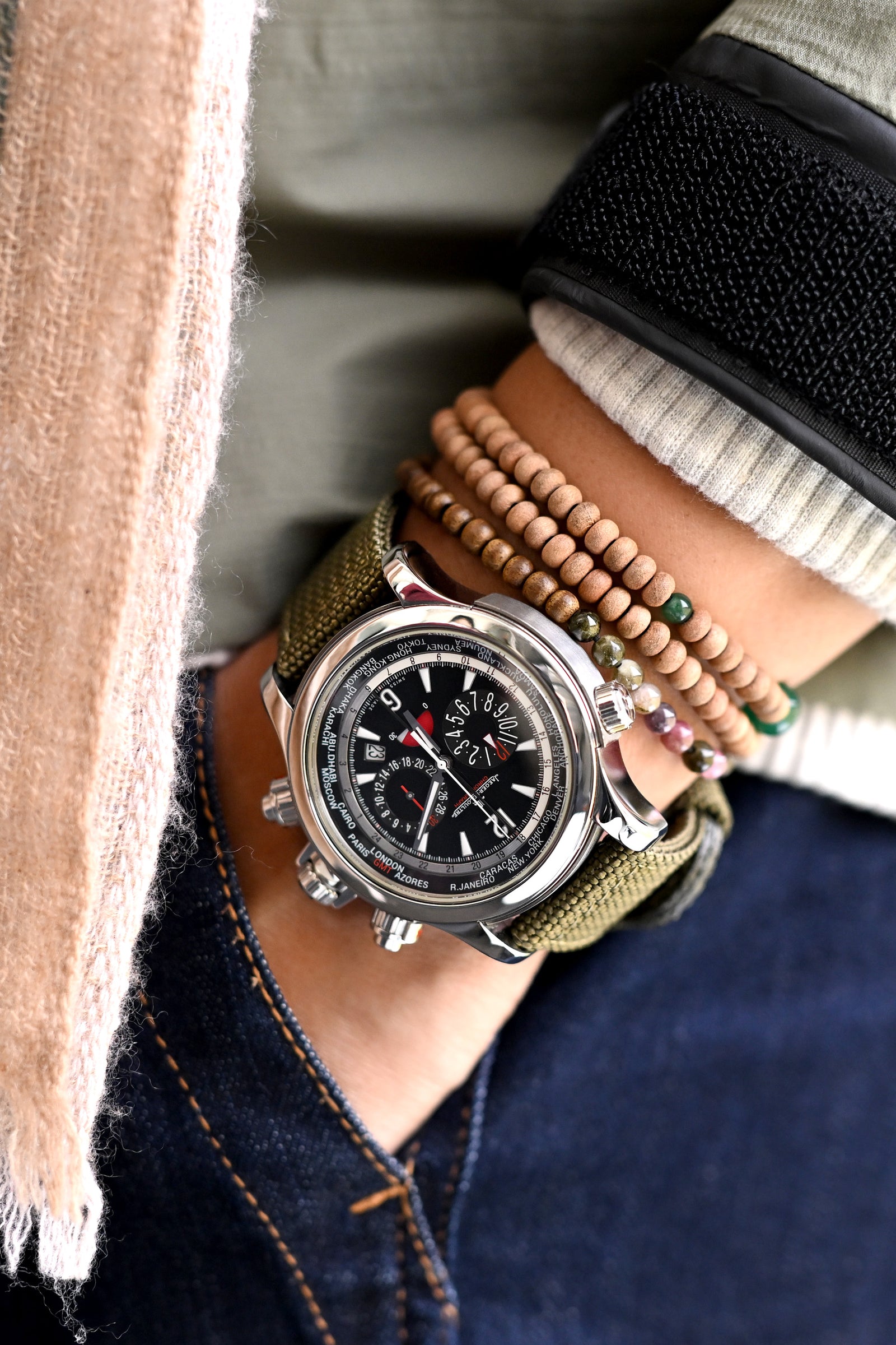 探検に備えたラグジュアリーの定義 - ジャガー・ルクルト マスターコンプレッサー エクストリーム ワールド クロノグラフの堂々たる存在感は、豪華なカシミアのタッチと大胆なストライプパターンで和らげられ、ミリタリーグリーンのプレミアムナイロンウォッチストラップがその戦術的要素を導入し、天然の二重層チェリーウッドビーズと香り高いアガーウッドアクセサリーが、頑丈な探検と洗練された鑑賞の完璧なバランスを生み出します。